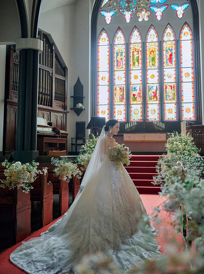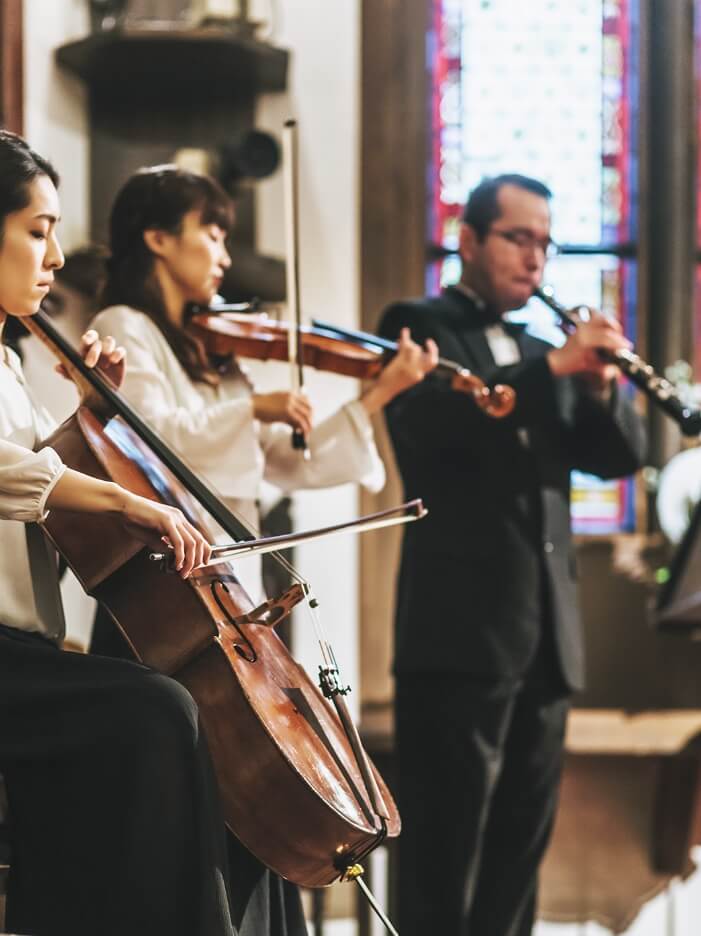 時間によって表情を変えるステンドグラスが美しい大聖堂はまさにオーセンティックの象徴といえる存在。10名もの音楽家が奏でる「音楽挙式」はセント・マーガレット ウエディングならではの価値ある時間に。