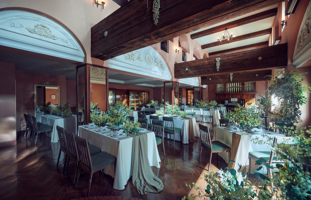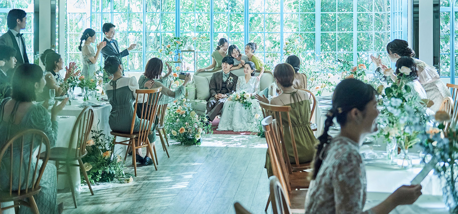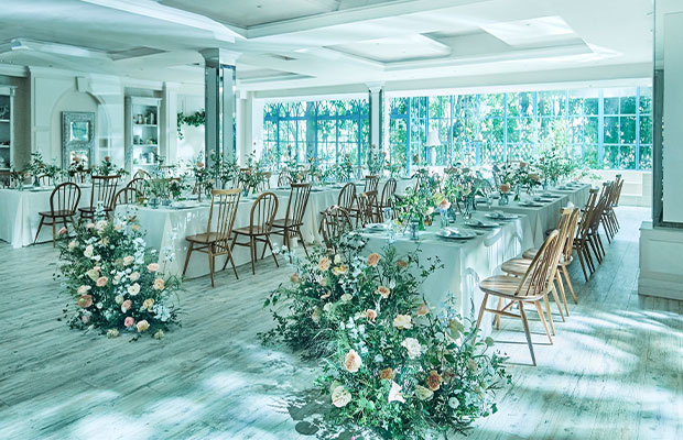 窓辺の木々から木漏れ日が降り注ぐ、ナチュラルな雰囲気のパーティ会場。