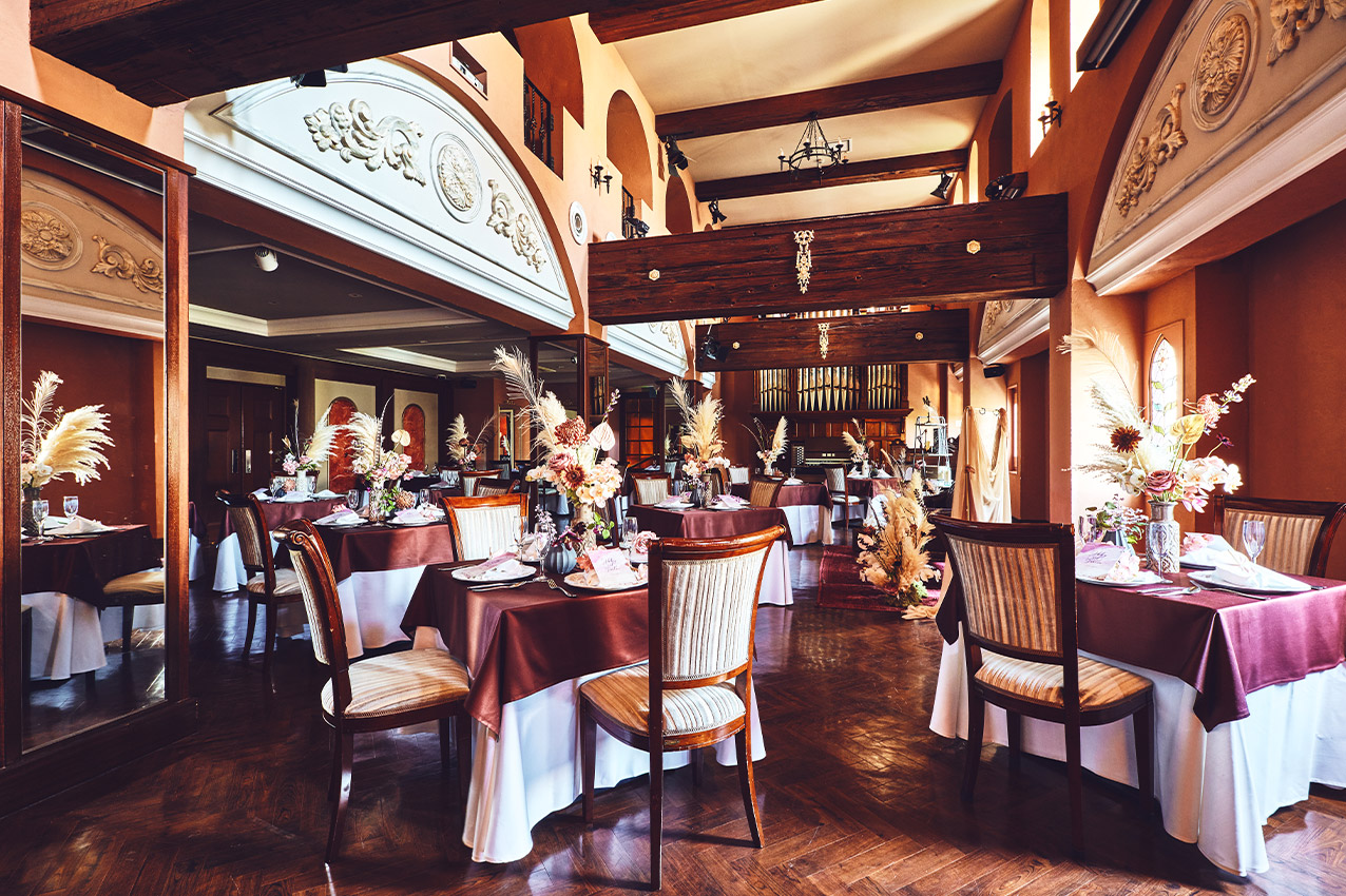 ステンドグラスやパイプオルガンなどアンティークが随所に薫るパーティ会場。