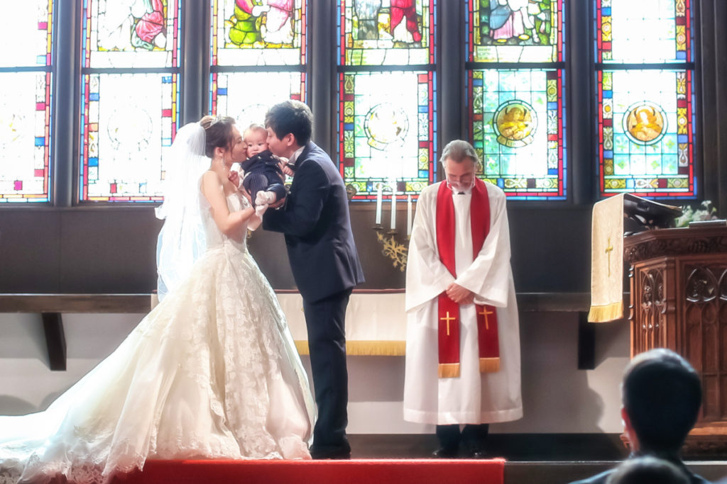 コロナで一年延期した結婚式でしたが、その間に息子が生まれゲストにお披露目することができました。父へ感謝を込めて一輪の花を渡し、息子含め4人で祭壇へあがれたことは特別な思い出になりました。当日は天候にも恵まれ、丁度ステンドグラスから陽が差して幻想的で素敵だったよとゲストに言ってもらえて嬉しかったです。挙式中、常に介添人の方が丁寧にサポートしてくださったのであまり緊張せず挑むことができました。