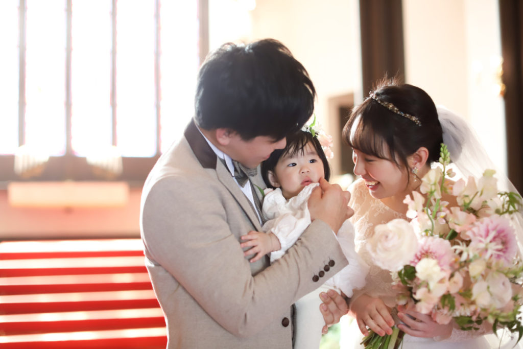 お子様のお披露目も兼ねてとの事で、大切なゲストの皆様に囲まれながら行ったお子様との挙式はとても温かく、ご結婚式の素敵さを改めて感じさせて頂きました。
