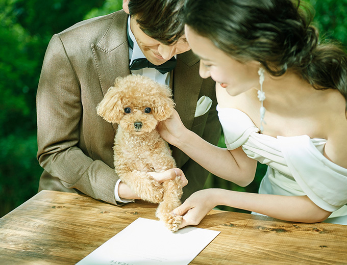 前撮りも当日の記念写真もペットと一緒に撮影OK!お揃いの衣装を用意したり、思い出に残る1枚を。