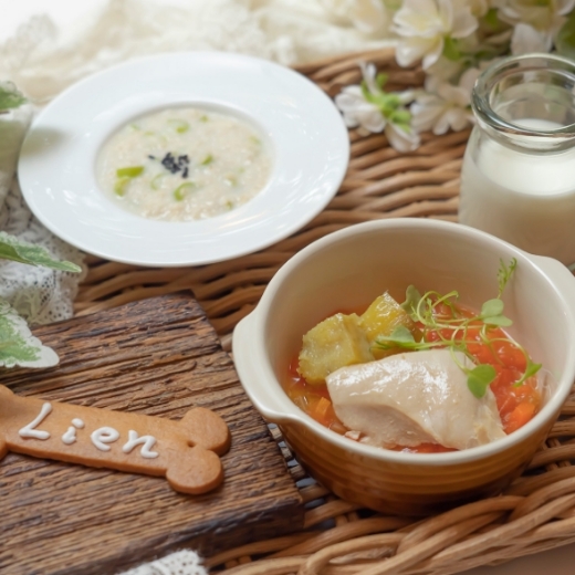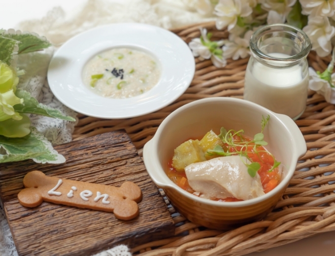 デザートまでついたペット専用コース。ペット用ケーキも準備が出来るので、おふたりと一緒にファーストバイトも叶います。(わんちゃん以外のペット料理もお気軽にご相談ください)