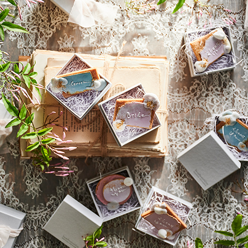 ウエルカムのプチガトーやお見送りで手渡すギフトもオーダーメイドが可能です。世界でひとつしかないスイーツがゲストの皆さまにも大変喜ばれています。